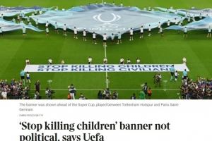 体育资讯8月14日讯 欧足联坚称,在热刺对阵巴黎圣日耳曼的超级杯赛前展示的“停止杀害儿童——停止杀害平民”横幅并非政治宣言,而是人道主义呼吁。